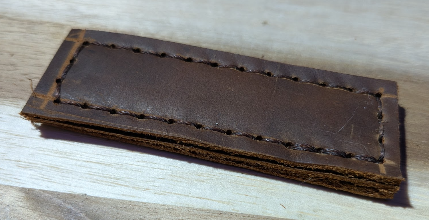 Day one consisted of practicing the saddle stitch on a couple scrap pieces of leather. I also laser engraved my logo on a piece of leather, so I attempted to stitch that for a key chain. Unfortunately the dimensions were a bit off on the key chain, but at least it's functional!