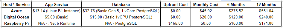 Considering costs for an entire year, self-hosting on a raspberry pi is going to be $70 cheaper than Digital Ocean and $380 cheaper than Azure, even with spending $165 on a raspberry pi kit that comes with an aluminum case, power cable, and 64g SD card.