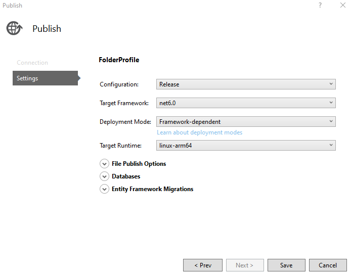First, we create a new framework-dependent publish profile targeting a folder for linux-arm64 from within visual studio.