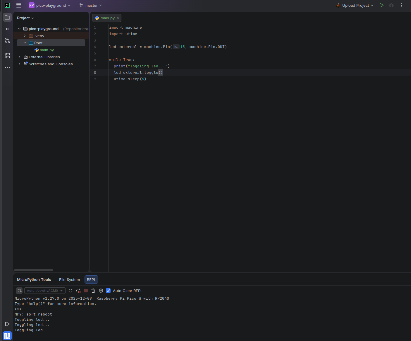 Now, you can click the "connect" button under the MicroPythonTools tab, make changes in Pycharm like you normally would, and then see the results after running the "upload" config
