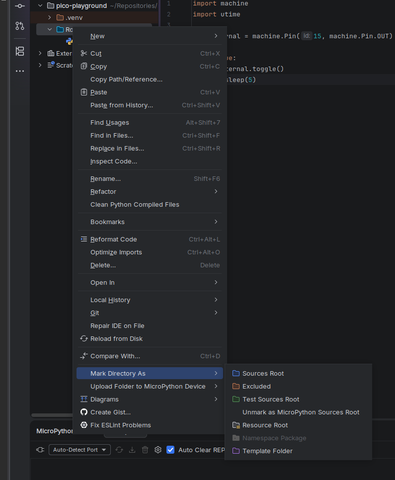 Finally, after creating a new project and "Root" directory, you can mark the directory as the "MicroPython Sources Root" which, when running the upload configuration, will push everything in that directory to the root of the Pico