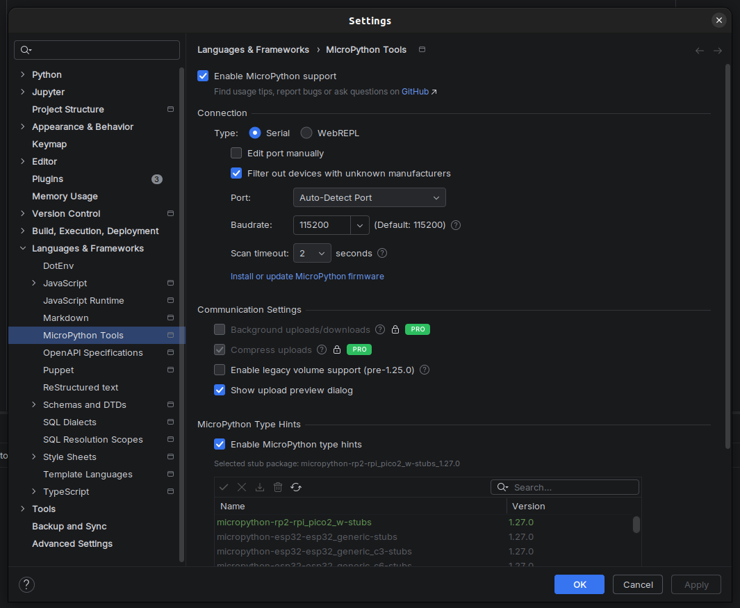 I tried some extensions in VS Code multiple times - both on Windows and Linux - but never had much success getting them to work. The other night, though, I decided to step back into micropython and went looking for something that might work with Pycharm. I'm happy to say I found the MicroPython Tools plugin, and it works great.