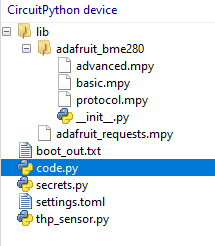 To keep things separated, all of the actual sensor logic will live in thp_sensor.py while secrets such as the wireless SSID & password will live in secrets.py. Code.py is essentially the "main" file that runs when powering the system on.